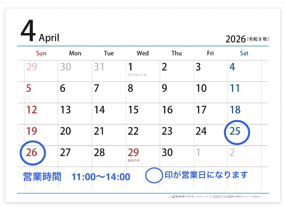 ※営業時間 11:00〜14:00※定休日 GW~7月と9月は月曜日〜金曜日(祝日除く) 8月不定休・10月〜4月冬季休業※営業日 GW~7月と9月は土・日曜日と祝日